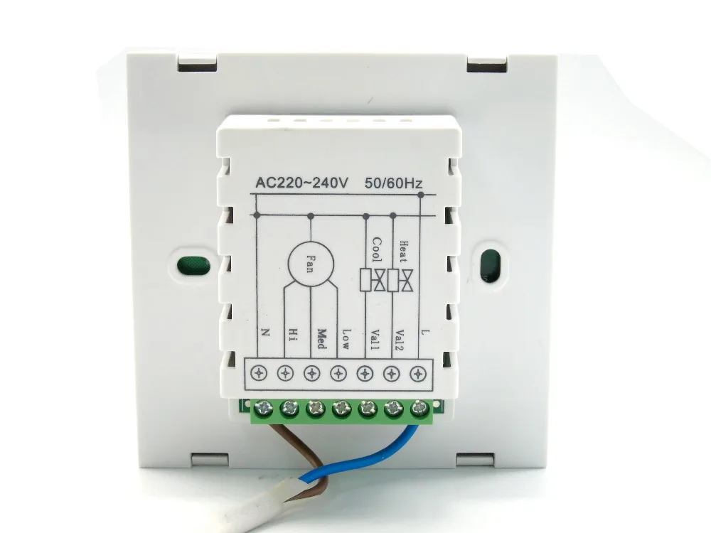 Механический термостат — самый простой и дешевый вариант управления фанкойлом. Он имеет центральный регулятор температуры в виде колесика, тумблер вкл/выкл, тумблер для переключения скоростей (обычно 3 скорости) и переключатель «Тепло/холод») для моделей с функцией тепла. Есть редкие экземпляры механических термостатов у которых есть ЖК дисплей.