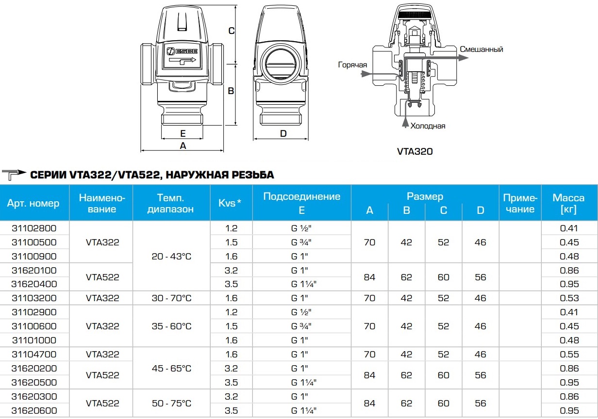 Термостатический смесительный клапан ESBE серии VTA 322