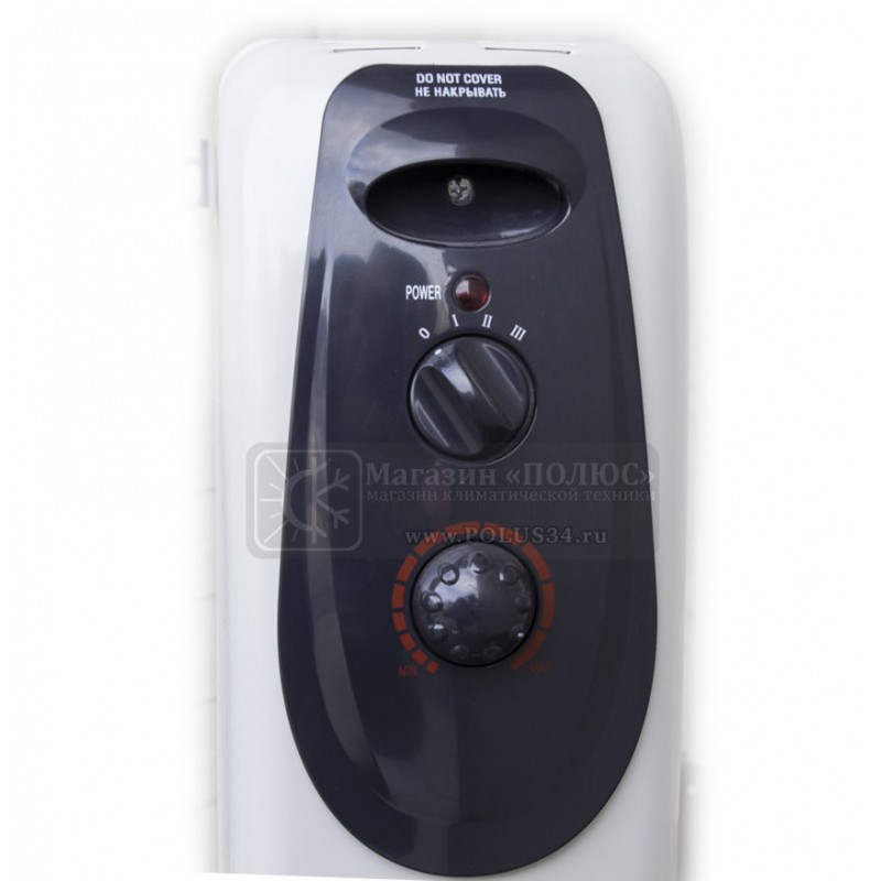 Этот обогреватель, состоящий из 9 секций, с трехступенчатым регулятором мощности 1500 Вт. Термостат на этой модели механический , поэтому программирование возможно только ручкой, на переключателе есть подсветка. Из-за бюджетной модели в ней не предусмотрен таймер, но есть датчик автоматического отключения при перегреве.
