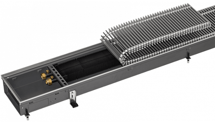 Длинный и широкий напольный встраиваемый конвектор. Может использоваться как самостоятельный нагревательный элемент, так как обладает высокой мощностью и хорошими эксплуатационными характеристиками. Трубка теплообменника изготовлена из меди с тонкими алюминиевыми пластинами, которые достаточно быстро нагреваются. Монтаж простой, подключается к одно- и двухтрубной системе отопления, сверху украшается решеткой. Она не входит в комплект поставки, но вы можете выбрать решетку из алюминия, нержавеющей стали или дерева, чтобы она составляла единый элемент с полом.
