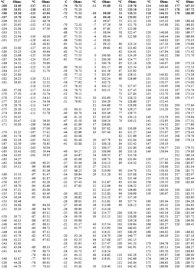 | Temp. °C | Ω | Ω | Ω | Ω | Ω | Ω | Ω | Ω |