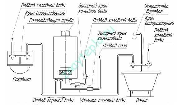 Теперь приведу типовую схему монтажа проточного газового водонагревателя. Смотрите на еще одну картинку:
