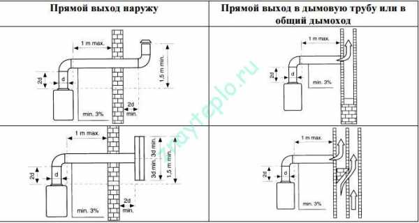 - Соединение водонагревателя и дымохода должно быть герметичным и выполнено с уклоном 3%. Примеры подключения дымохода смотрите ниже:
