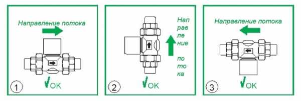 При монтаже необходимо соблюдать направление потока, согласно стрелкам на корпусе вентиля.