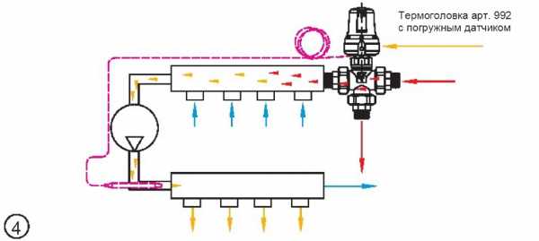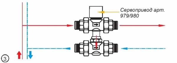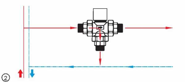 Зонный вентиль 3-х ходовой арт. 301 может использоваться в качестве смесителя, если его установить на прямой линии. В этом случае, вентиль будет поддерживать установленную температуру, смешивая воду прямой и обратной линии.