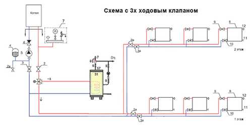 Такой цикл продолжается до тех пор, пока вода в водонагревателе не станет заданной температуры. После чего клапан становится в прежнее положение, и жидкость устремляется на отопление здания. Следует отметить, что управление клапаном осуществляется по непосредственному сигналу термостата.