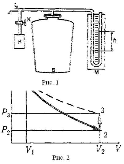 Таким образом, для определения отношения теплоёмкостей воздуха достаточно осуществить процессы (1-2-3) и измерить показания манометра Н и h в состояниях газа 1 и 3 соответственно.