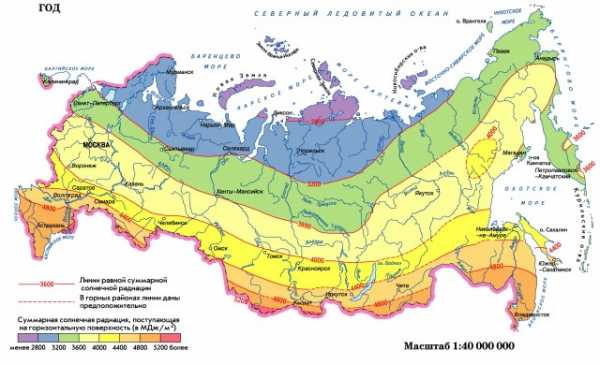 Солнечная суммарная радиация в России распределена, на первый взгляд, неожиданно. На территории нашей страны, как ни странно, вовсе не черноморские курорты держат пальму первенства. Самые большие дозы солнечного излучения приходятся на территории, пограничные с Китаем, и Северную Землю. В целом солнечная радиация в России особой интенсивностью не отличается, что вполне объясняется нашим северным географическим положением. Минимальное количество солнечного света достается северо-западному региону – Санкт-Петербургу вместе с прилегающими районами.