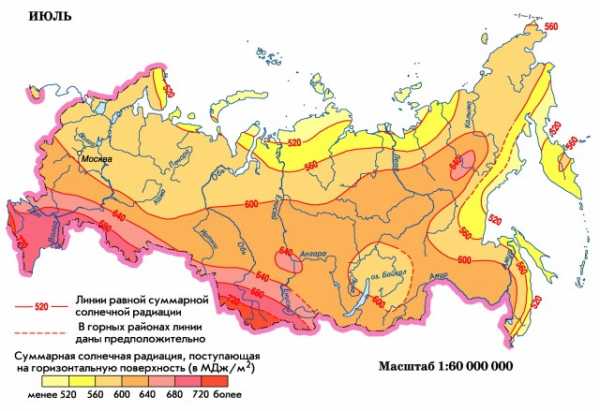 Во все сезоны года суммы суммарной радиации возрастают с севера на юг в соответствии с изменением высоты солнца. Исключение составляет период с мая по июль, когда сочетание большой продолжительности дня и высоты солнца обеспечивает довольно высокие значения суммарной радиации на севере.