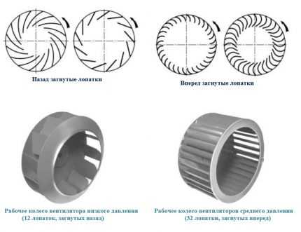 Вентилятор радиального типа развивает значительно большее давление, чем осевой вариант. Это обусловлено сообщением порции попавшего в барабан воздуха энергии, формируемой при переходе от входа к выходу из системы