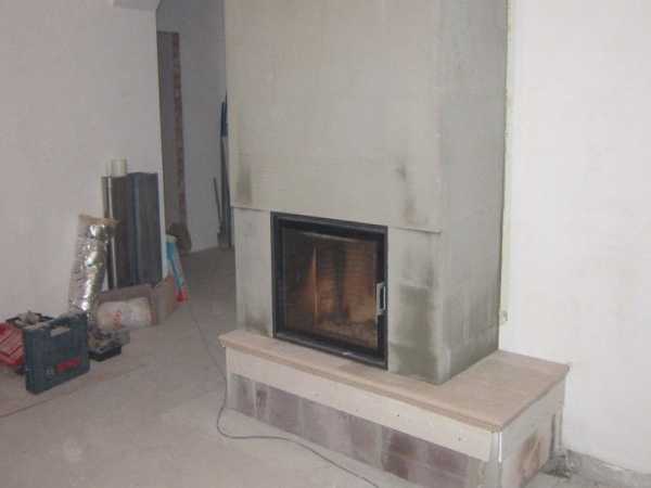 Отделочные работы составили облицовку полку плиткой, в то время как сама поверхность камина была оштукатурена печной моделирующей штукатуркой.