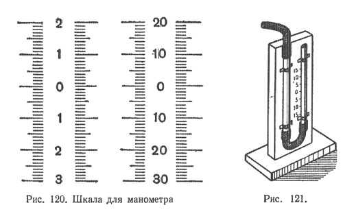 Для измерения малых разностей давления служат жидкостные манометры. Для изготовления жидкостного манометра требуется довольно длинная (в 1,5 м) стеклянная трубка. Разогрев её на пламени примуса или газа, надо осторожно согнуть трубку коленом так, чтобы одна часть трубки была примерно вдвое больше другой. Когда трубка остынет, короткий конец её слегка разогреть и отогнуть под углом, как указано на рисунке 118. Из двух толстых деревянных дощечек приготовить стойку под манометр.