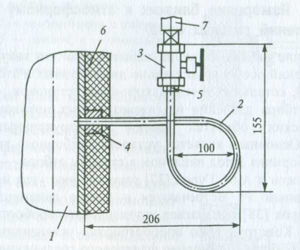 1 – трубопровод; 2 – сифонный отвод; 3 – клапан; 4 – штуцер; 5 – футорка; 6 – теплоизоляция