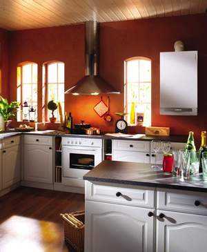 Настенные котлы имеют небольшие размеры, благодаря чему их можно вписать в интерьер любой кухни. Мощность таких котлов до 60 кВт. Конструктивно они разделяются на котлы, оснащенные атмосферной горелкой, и котлы с вентиляционной горелкой.