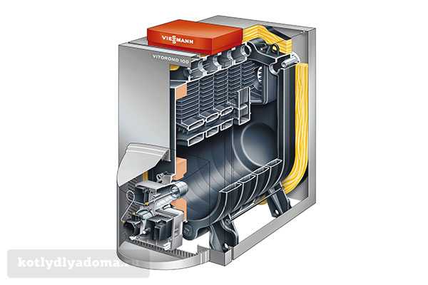 Фото 3: Напольный котел «Viessmann» Vitorond 100 с чугунным теплообменникомОсновное преимущество напольного газового котла с чугунным теплообменником это долгий срок службы. Такой теплообменник не боится коррозии и способен при надлежащем уходе и использовании может прослужить несколько десятков лет. Однако у него есть один существенный недостаток — высокая чувствительность к перепадам температур. При установке чугунного котла следует правильно выбирать схему обвязки, исключающую низкие температуры теплоносителя в обратной линии. Среди других минусов можно выделить большой вес и высокую стоимость. Помимо газовых, многие производители выпускают большой модельный ряд твердотопливных котлов отопления с чугунными теплообменниками.