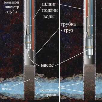 - В шахту опускается шланг с грузом. На высоте в 35 см от дна устанавливается глубинный насос.