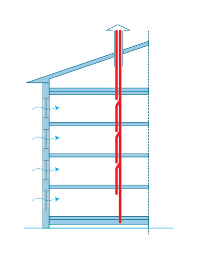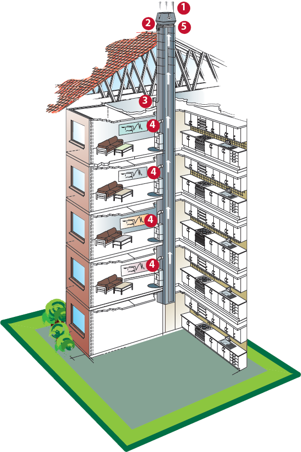 Квартиры в таких зданиях состоят из нескольких вентиляторов, которые выводят воздух из ванных комнат, кухонь или из обеих комнат. Воздух поступает в общую шахту, которая ведет к нескольким квартирам. Они чрезвычайно эффективны при вытяжке воздуха из ванных комнат, которые обычно являются местом с высокой влажностью и источниками запаха.